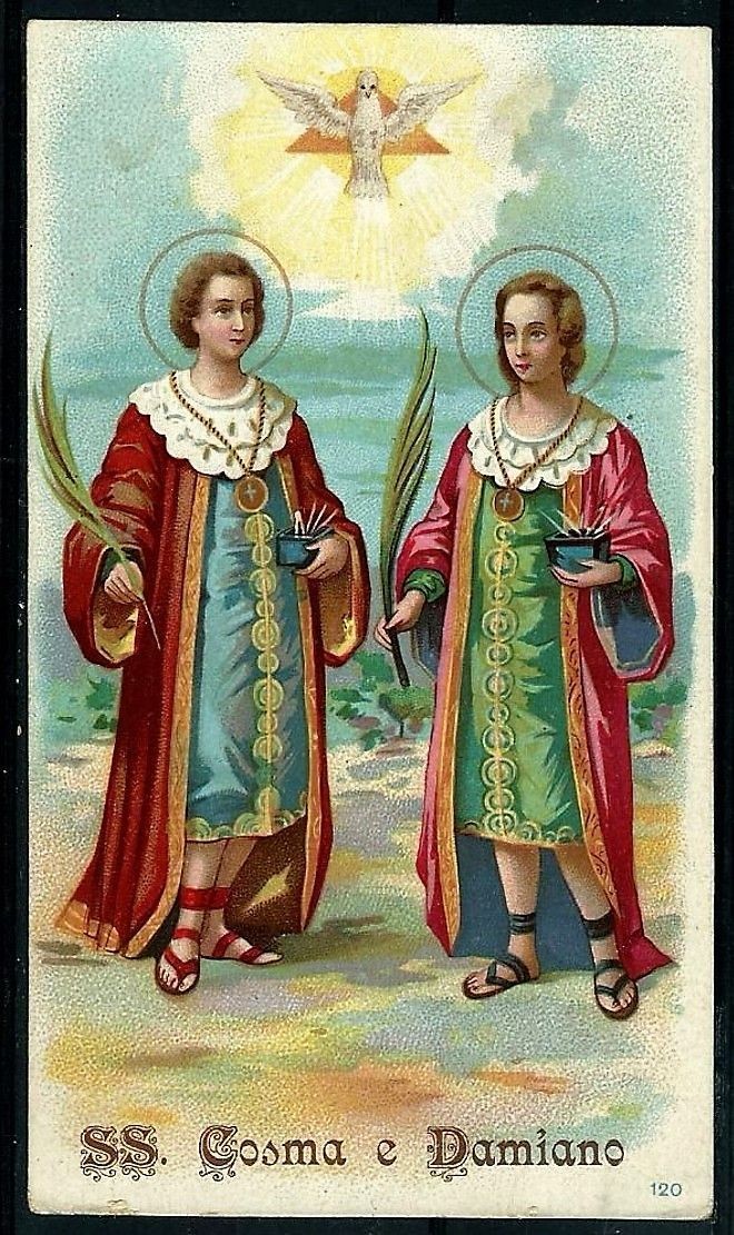 Cosmas and Damião are considered the patrons of doctors and surgeons and are sometimes represented by medical emblems.