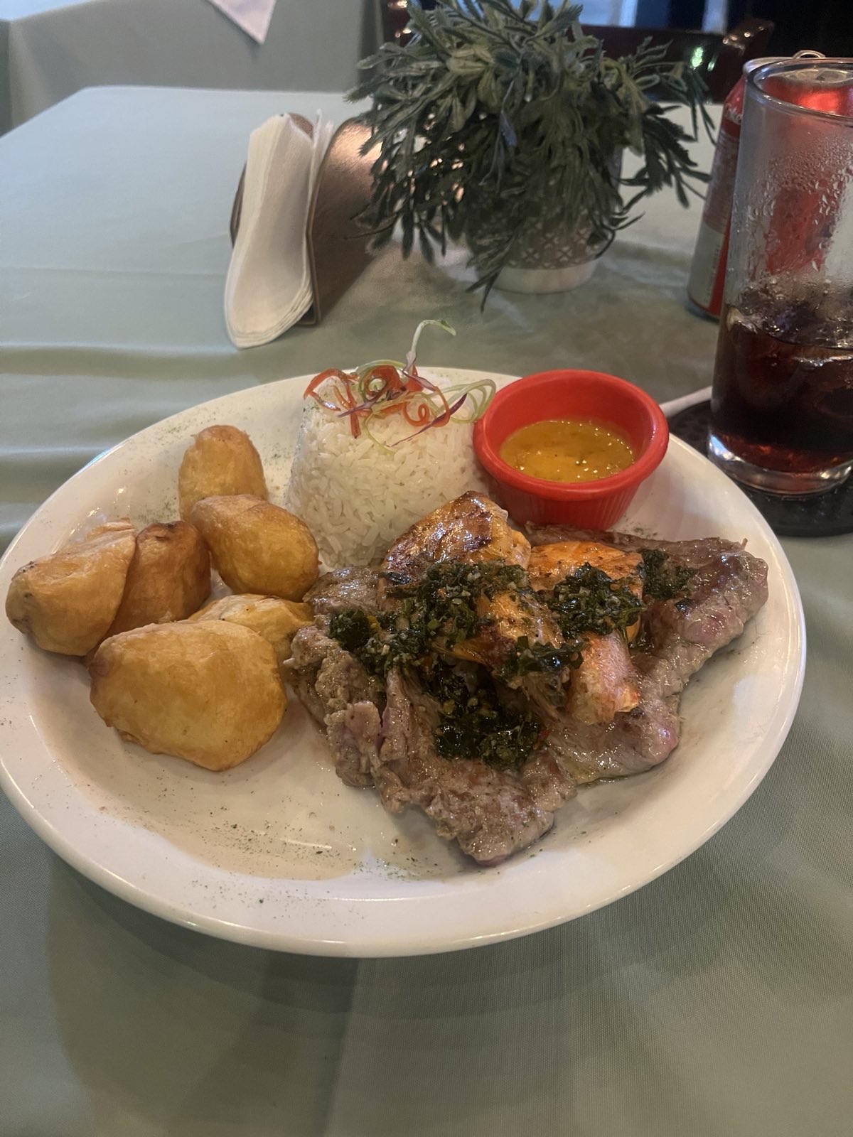 A typical El Salvadorian meal, Potatoes, rice, meat and shrimp.
