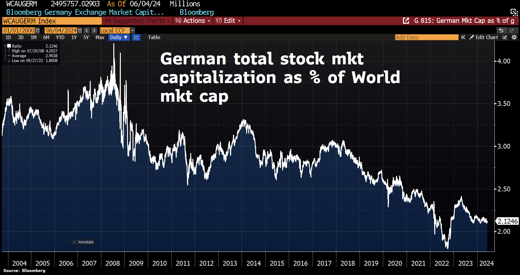 This means as much as: we are of the opinion that any problem can be printed out of the world with an artificially created monetary unit. Germany subsequently proved that this was not the case! Measured in terms of the capitalization of its major share index, the German economy has been steadily losing ground internationally, and most recently at an accelerating rate. The fatal energy policy, the war on key technologies, the automotive sector and the phasing out of nuclear energy - these are all milestones that have plunged the country into a serious crisis. The stubbornness of Germany's green ideological insanity policy will continue down this path and place an ever greater economic burden on the lives of the people in the country.