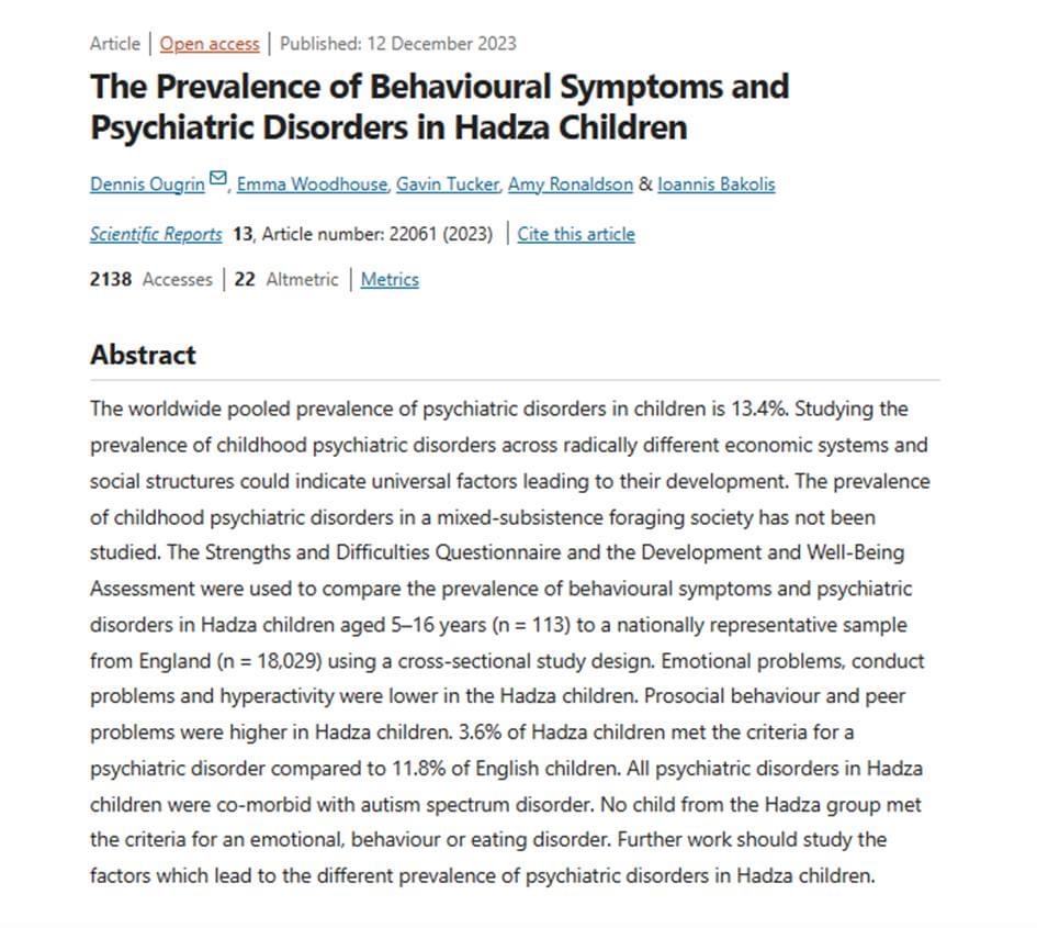 Emotional problems, conduct problems and hyperactivity were lower in the Hadza children (n=113). Prosocial behaviour and peer problems were higher in Hadza children. 3.6% of Hadza children met the criteria for a psychiatric disorder compared to 11.8% of English children.