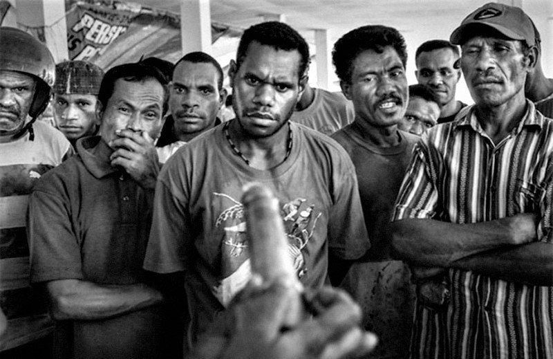 6 - Men paying attention to the instructions for using condoms, Papua, Indonesia, 1960s