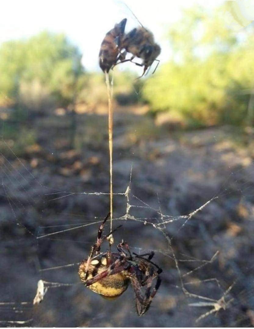 A bee flew away collecting nectar when she got stuck in a spider's web. She fought for her life until the last moment, stabbing her stinger into the spider. 🐝🕷️ Both died, but were “connected” by the structure of the stinger.