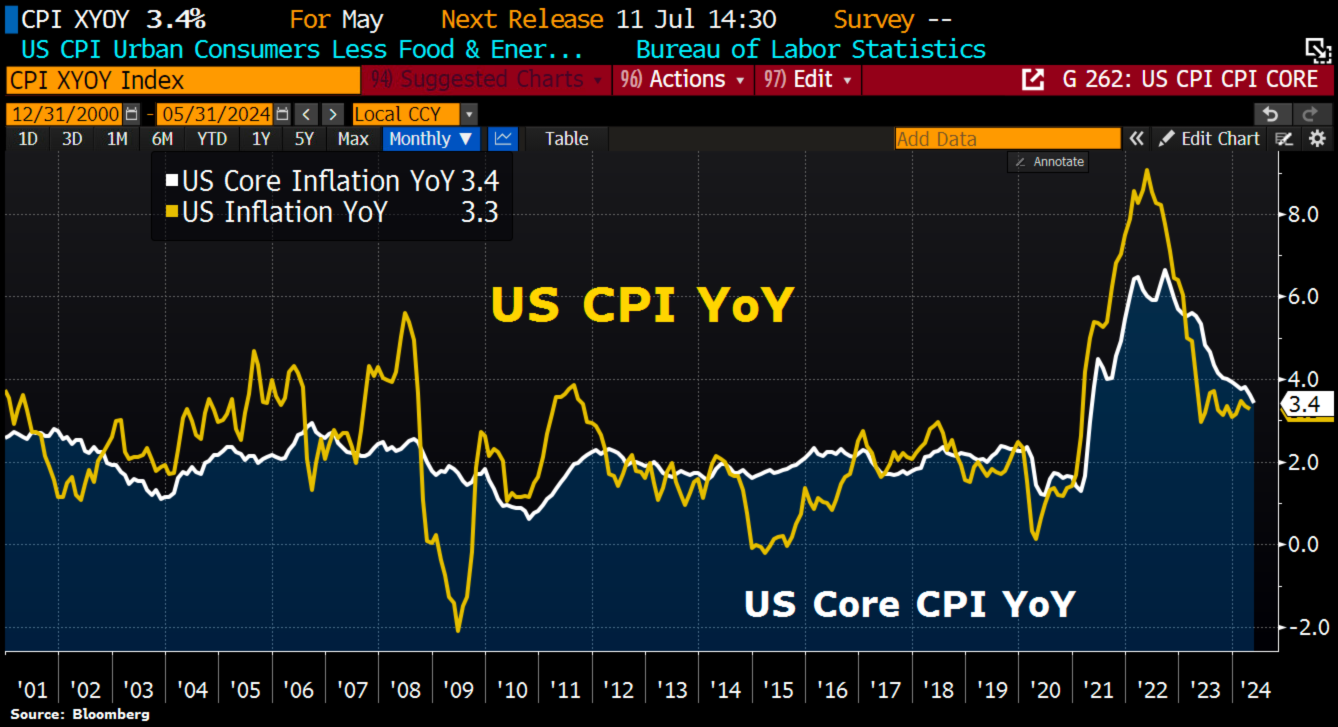 US inflation rates for May have come in lower than anticipated, igniting a rally in both bonds and stocks. Headline CPI dropped by 10 basis points to 3.3% year-over-year, defying the expected 3.4%. Core inflation saw a 20 basis point decrease to 3.4%, against predictions of 3.5%. However, this positive trend could reverse quickly if geopolitical tensions drive energy prices up.