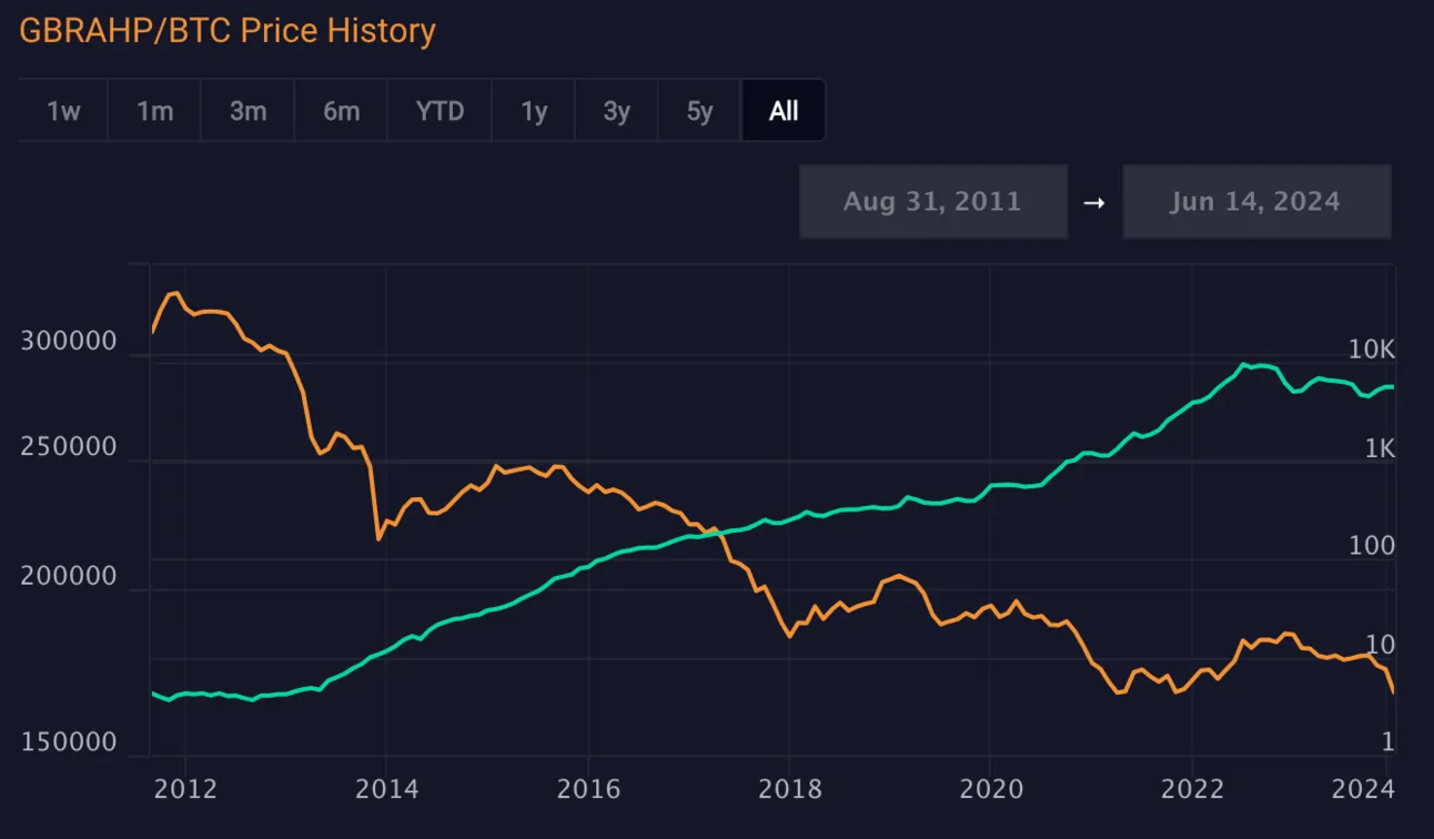 United Kingdom Average House Price in Fiat (Green) and BTC (orange)