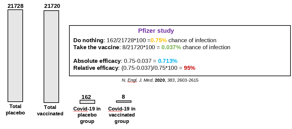 Shortly on 30 Dec 2020, Moderna reported very similar efficacy results using the same relative efficacy twist, boosting the efficacy to 94% while the absolute efficacy was only 1.15% (i.e., reduction from 1,22% risk to 0.07%).