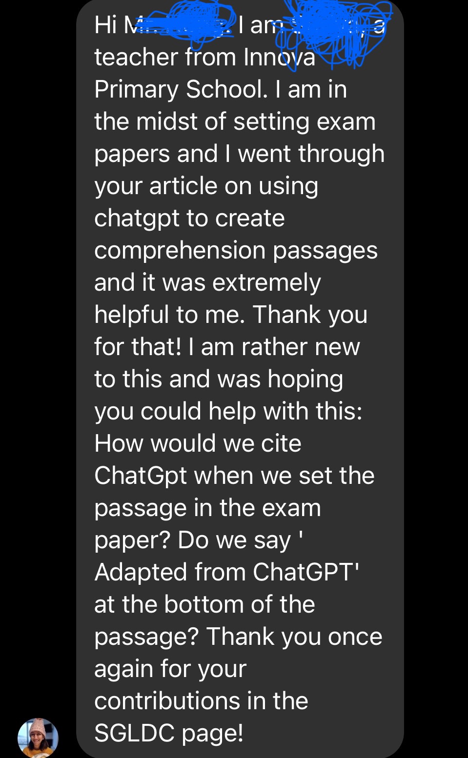 I got reminded of something when I received a FB message from a stranger yesterday. I had posted some ChatGPT-related insights on setting comprehension passages for examinations on a FB page connecting Singapore teachers from primary to pre-tertiary levels last year. This lady came across my post recently when she was researching for ideas on how to set comprehension passages. Apparently, my post helped her a bit.