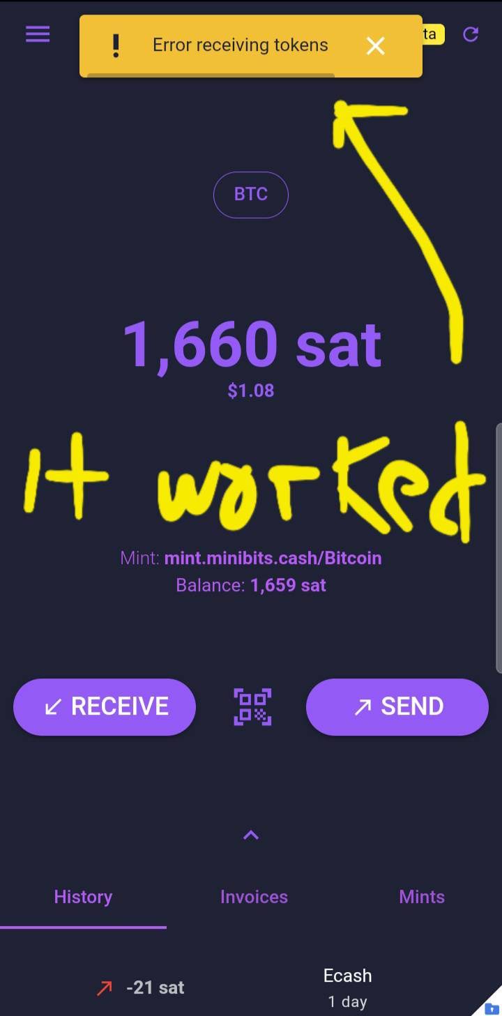 Yesterday 2024-06-20 around 20:04:07 UTC I got the sats. I almost immediately lost them. The cashu.me wallet seed and the 21 sats gone in ramdisk after a reboot :( I have some screenshots.