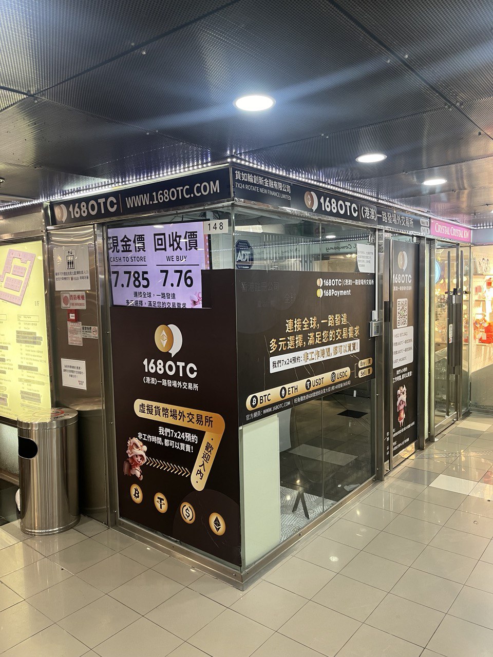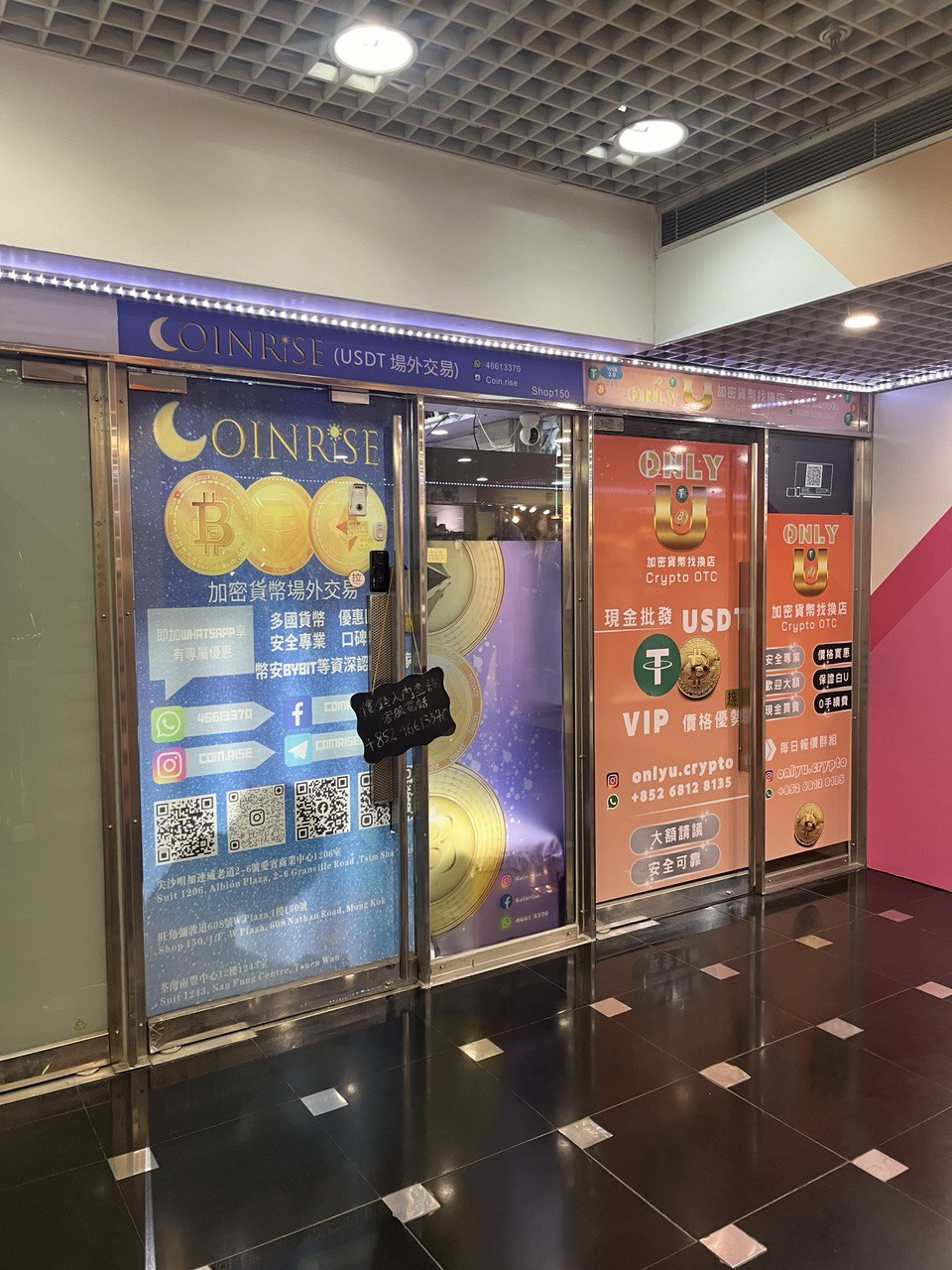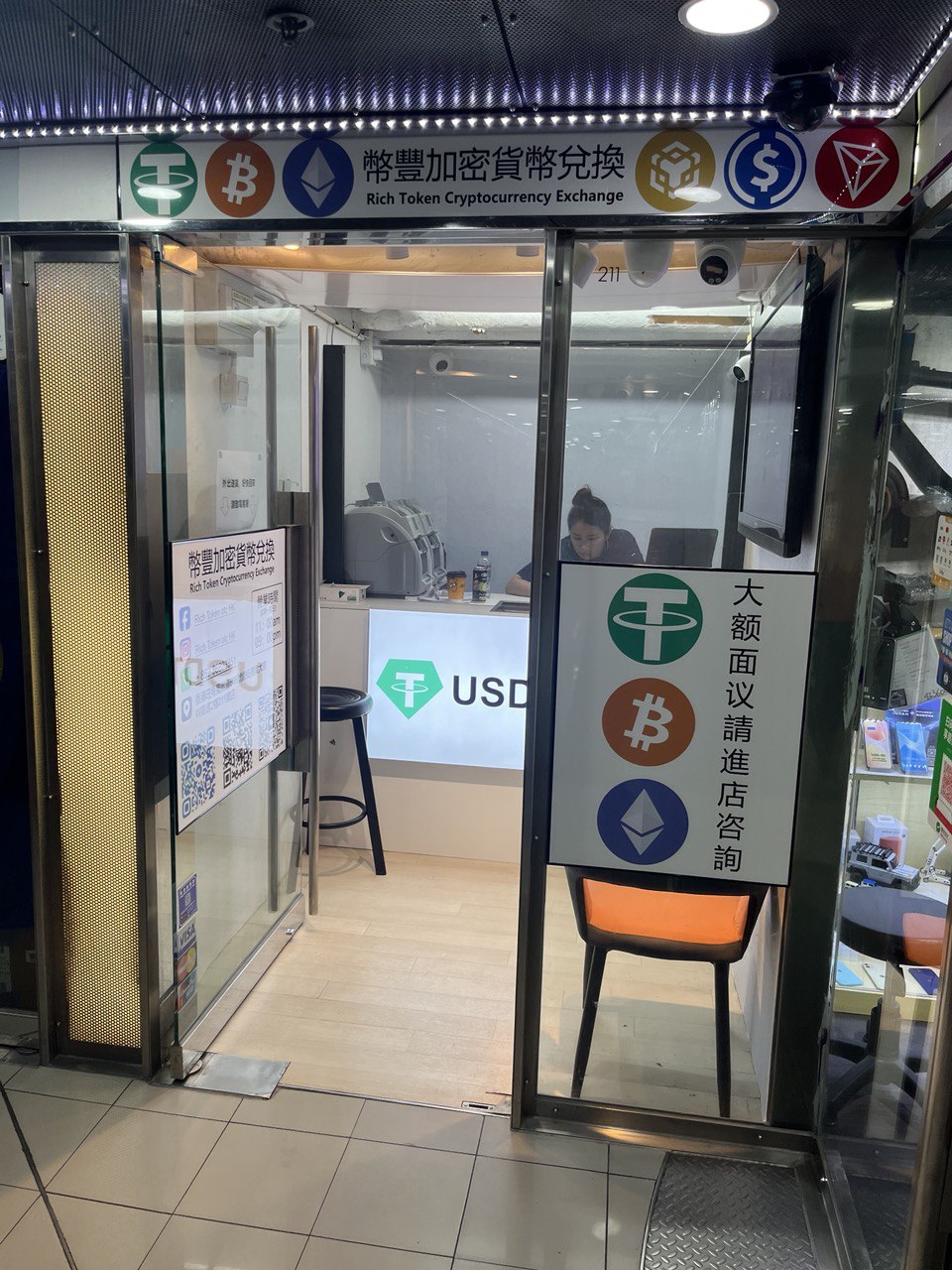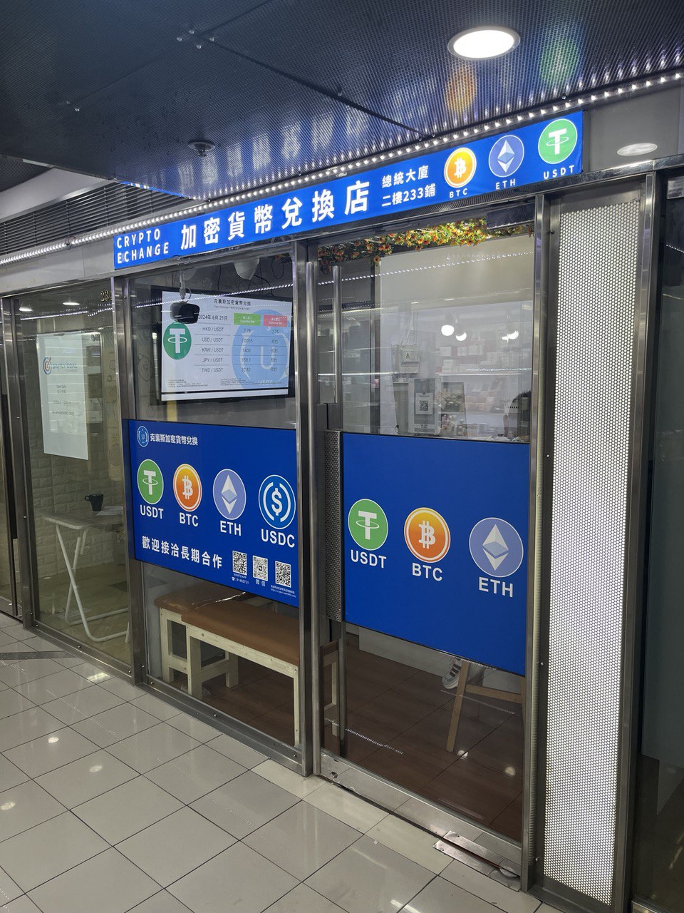 They trade in Bitcoin, Ethereum, Tether and pretty much any shitcoin under the sun, and it seems they really are quite active, judging from how many people were queuing up, leaving or entering these small shops. I suspect most trades are done through Tether on Tron on one side, and HKD cash on the other, but you can also trade USD, CNY, KRW, JPY, and probably more on request.