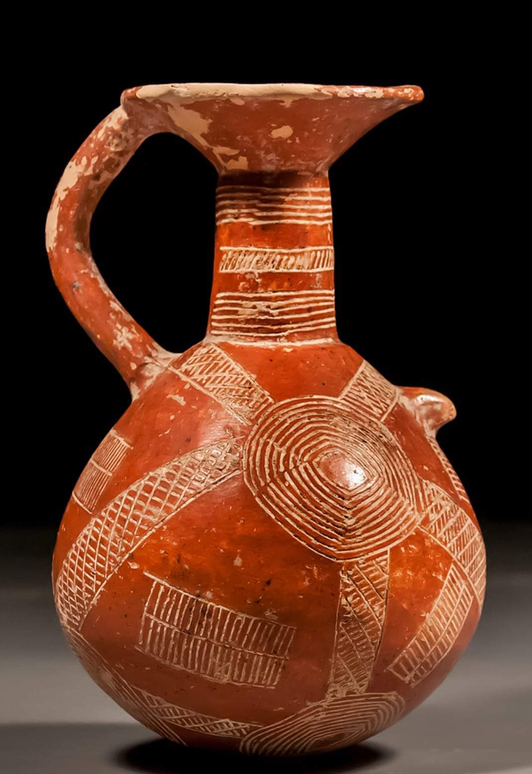 A red jar decorated with different incised patterns of lines, circles and grid patterns.
