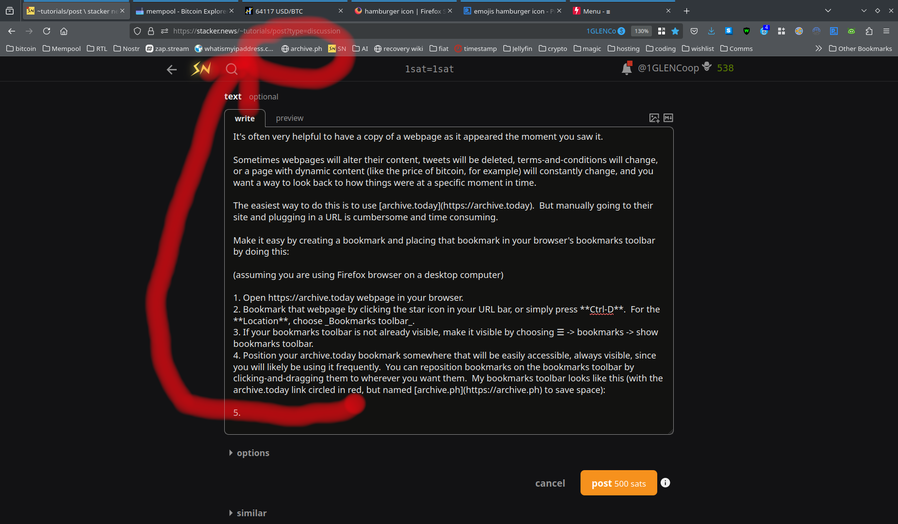 4. Position your archive.today bookmark somewhere that will be easily accessible, always visible, since you will likely be using it frequently. You can reposition bookmarks on the bookmarks toolbar by clicking-and-dragging them to wherever you want them. My bookmarks toolbar looks like this (with the archive.today link circled in red, but named archive.ph to save space):