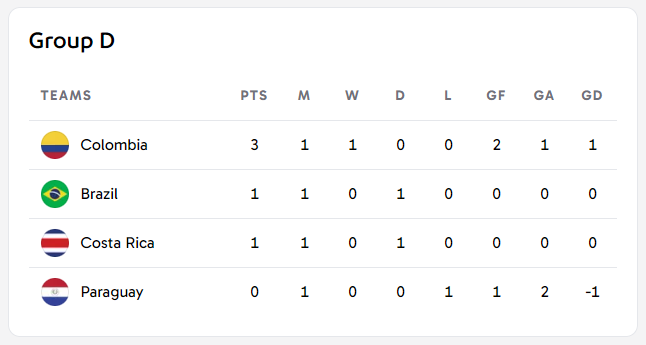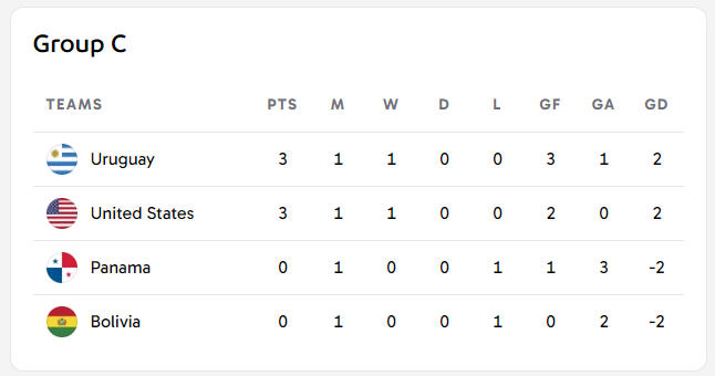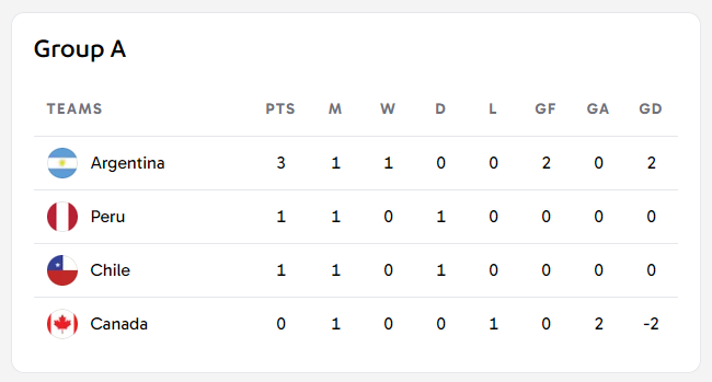 Surprisingly, I haven't come across any SN posts or news articles about the Copa América, even though it's taking place in the States. The group stage's opening round is over, and the standings are as follows: