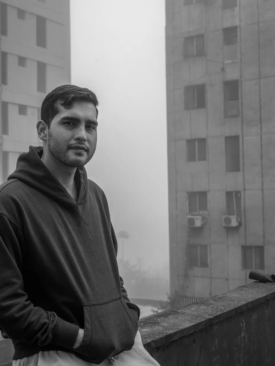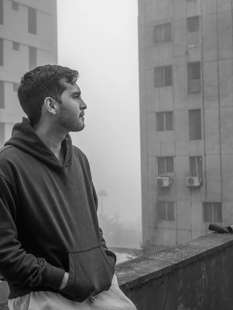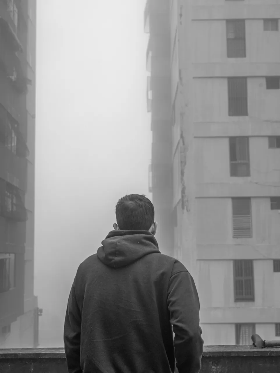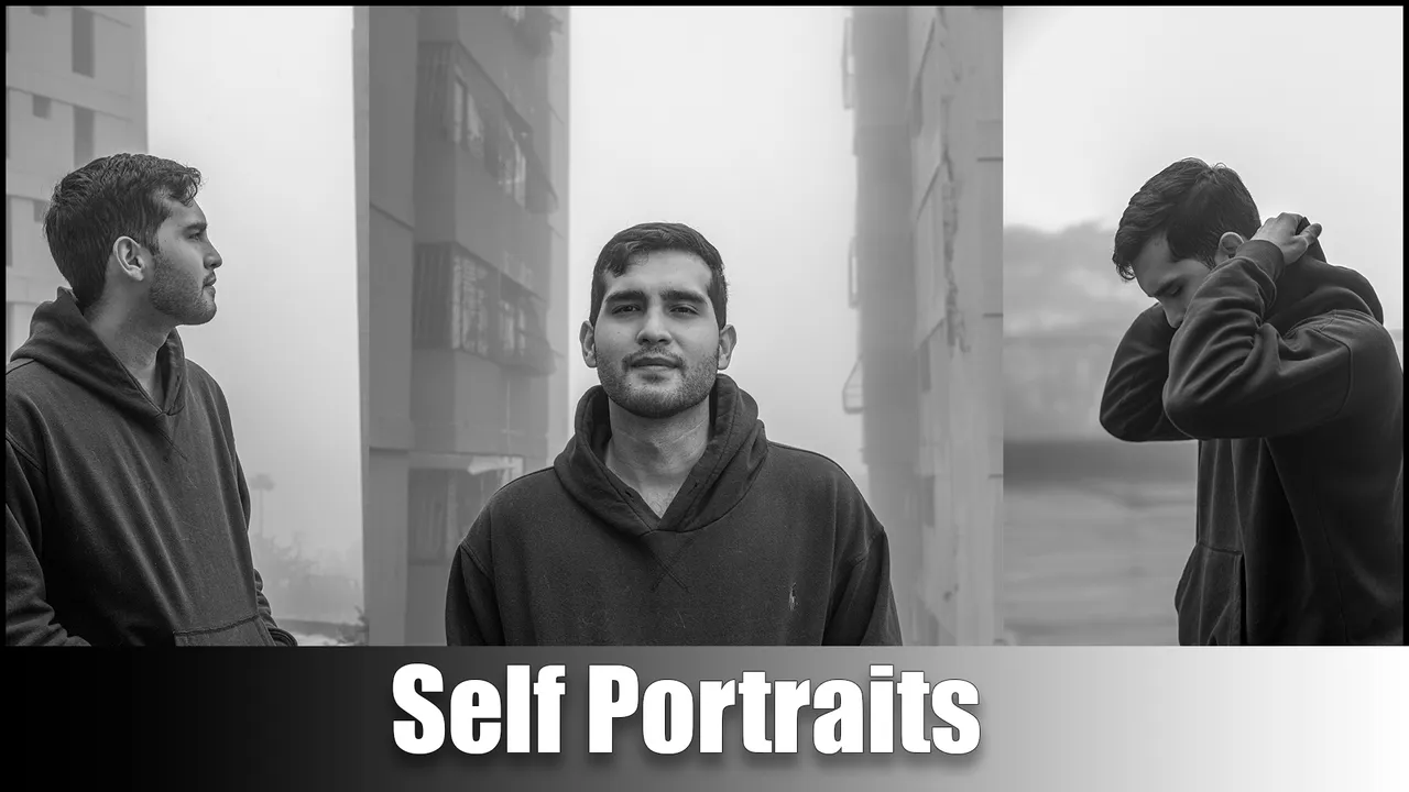 Yesterday I had the wonderful surprise of seeing the fog literally descend to the level of my window and when I looked out everything was filled with a thick fog so I grabbed my camera and tripod and went down to the common area of my building to take a series of self-portraits.