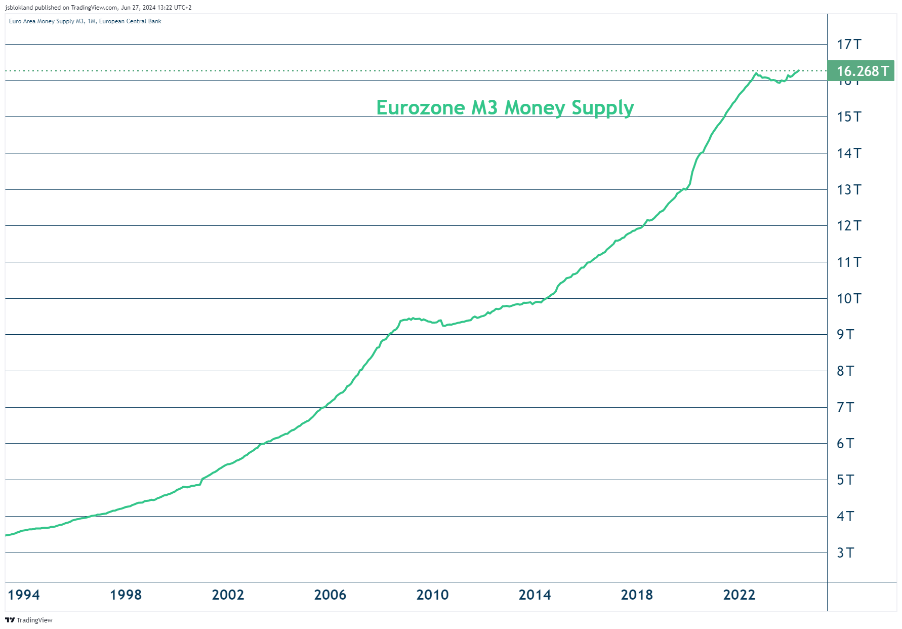 Finally some good news from the eurozone's money debasement scheme: the latest figures show that the M3 monetary aggregate is growing again. M3 is the broadest measure of money supply, encompassing: