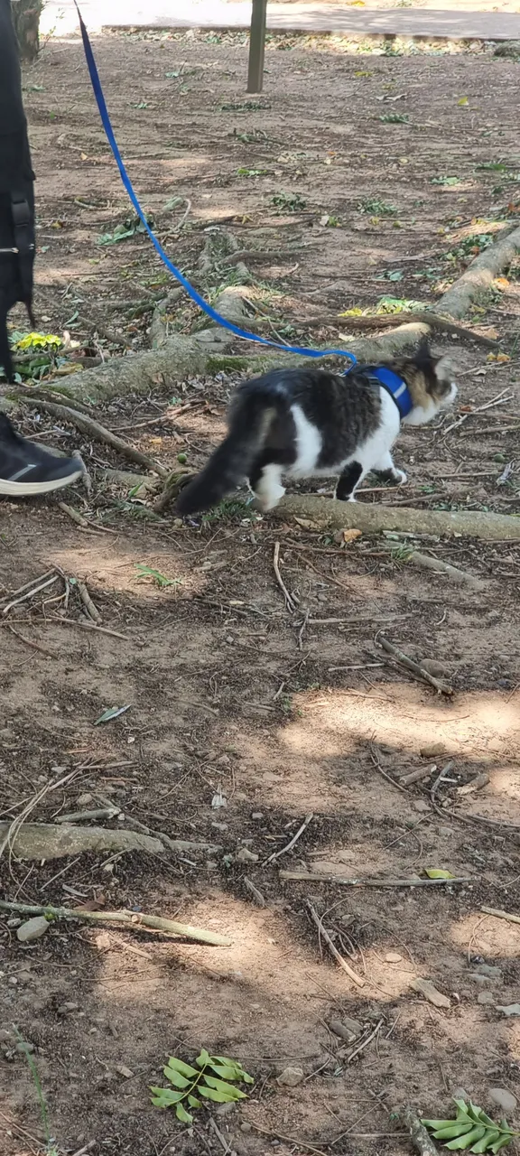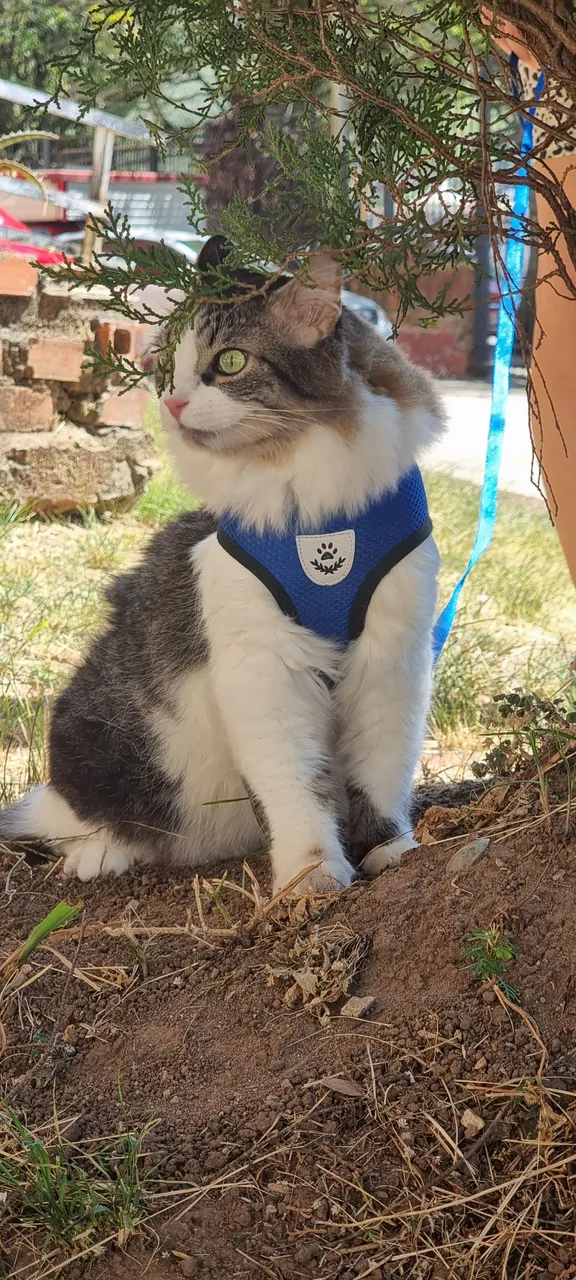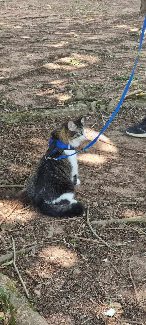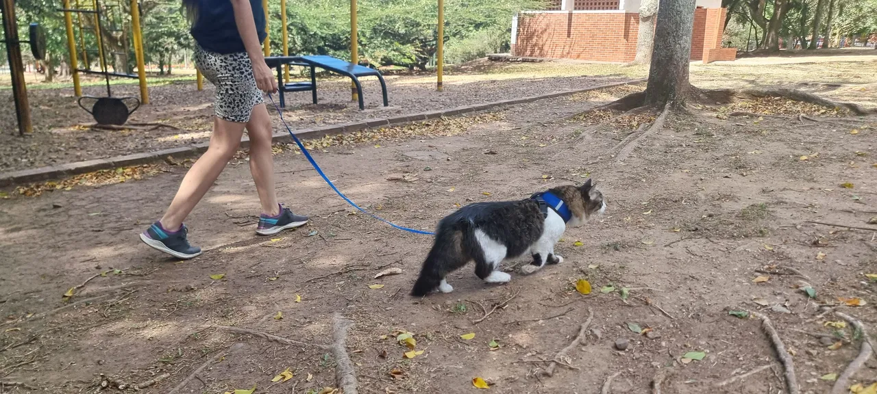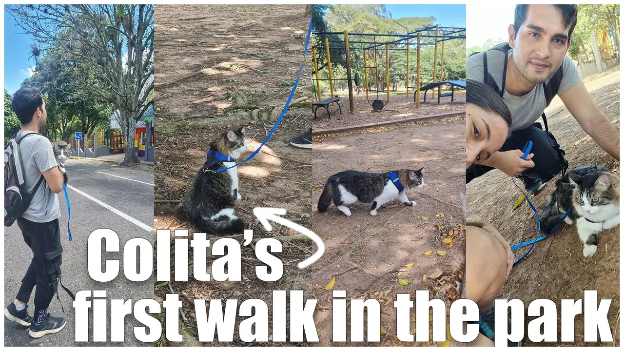 Today, Colita loves going for walks. Every night at the same time (10 pm), he starts meowing at the door so we can take him out for a walk, and he goes very happily!
