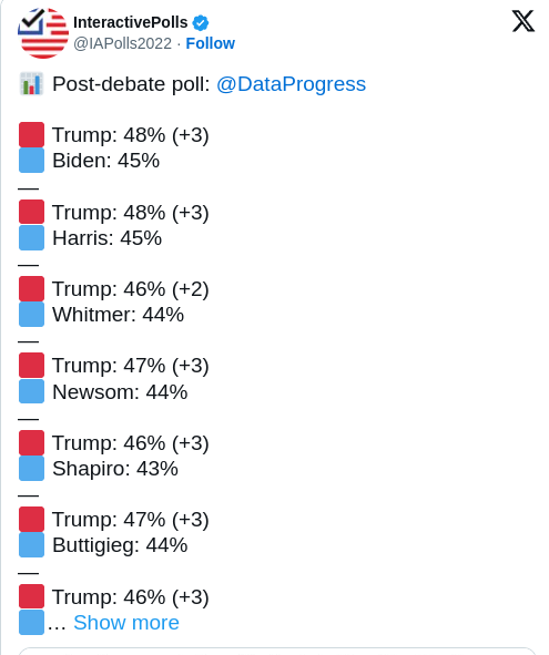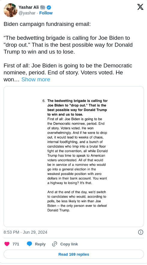Was a Trump versus Kennedy poll there? Because I think Trump gets smoked if the DNC offered a mea culpa and then brought Kennedy in as his replacement.