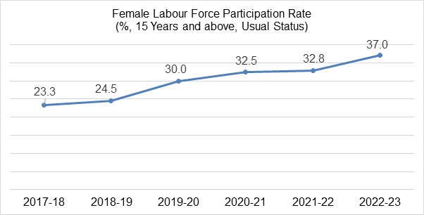 As per the Periodic Labour Force Survey (PLFS) by the Ministry of Statistics and Programme Implementation, female labour force participation in India improved to 37% in 2022-23, from 32.8% in 2021-22. However, this was still much lower compared with the global average of over 50%.