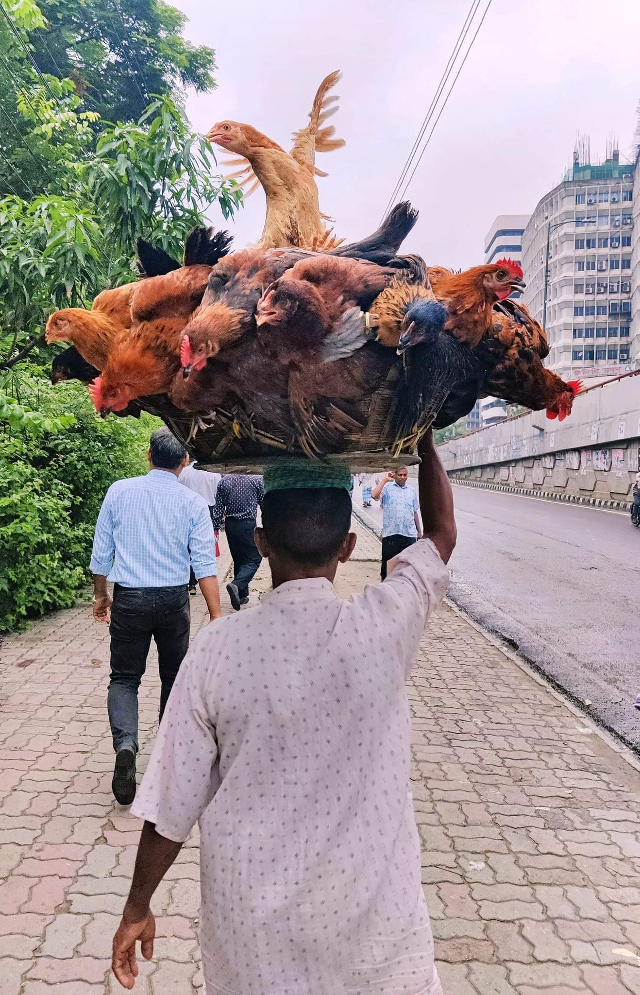 Balancing Life: A man carries a basket of chickens through the bustling streets
