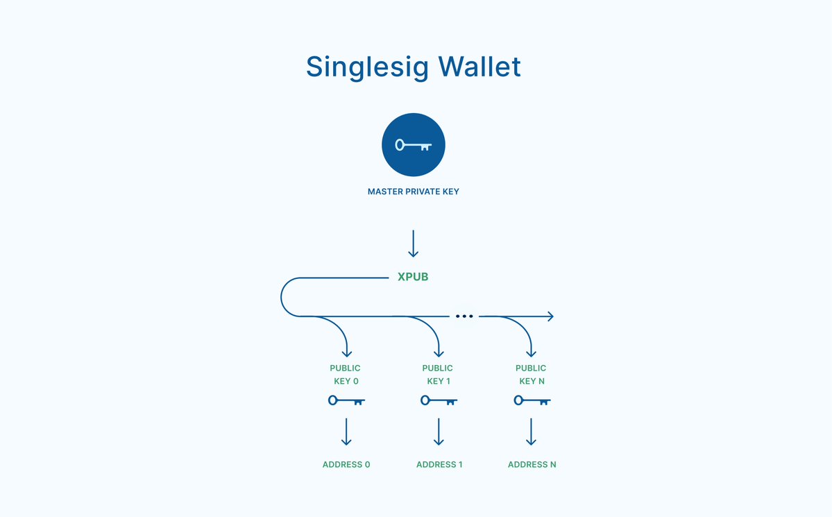 The following diagram provides basic imagery to show how a master private key is used for a singlesig wallet. It creates an xpub, which in turn creates child public keys and addresses for the wallet.