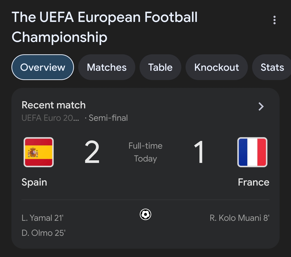 First tiebreaker: France to beat Spain 2-1 in extra time and progress.