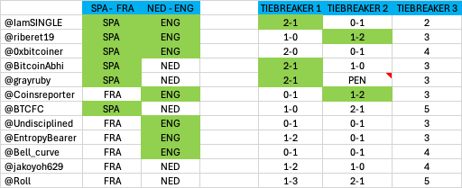 Please choose your pick in each fixture for the chance of winning 3000 sats. In addition, please give following tiebreakers: