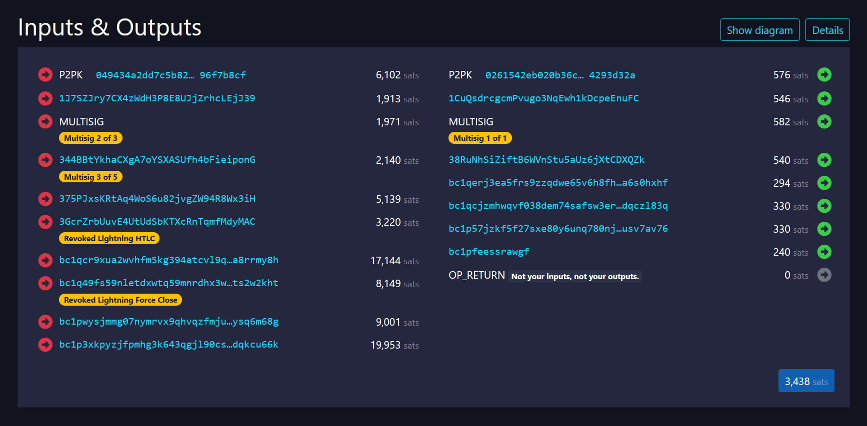 - The inputs have various multisig and Lightning-related scripts: bare multisig is a 2-of-3, legacy P2SH is a 3-of-5 multisig, wrapped P2WSH is a revoked Lightning HTLC, P2WSH is a revoked Lightning force close (often called "penalty transaction") with an unusually short CSV delay of 42, and P2TR script path is a 5-of-7 multisig (continuing the prime number pattern, and also a reference to the "5/7" meme).