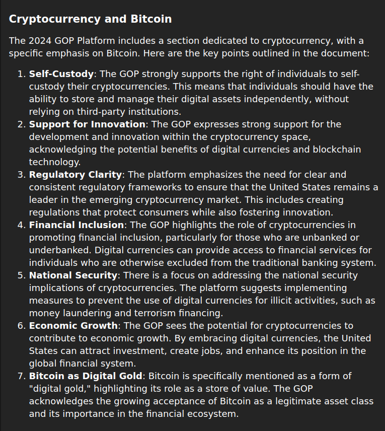 Today the #GOP #Republicans passed their draft platform in full support of #crypto #cryptocurrency #bitcoin summary below. I hate to get political but if you want #selfsovereignty you have to vote hashtag#Trump as hashtag#Biden has been a disaster for the industry.