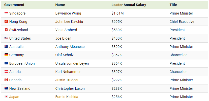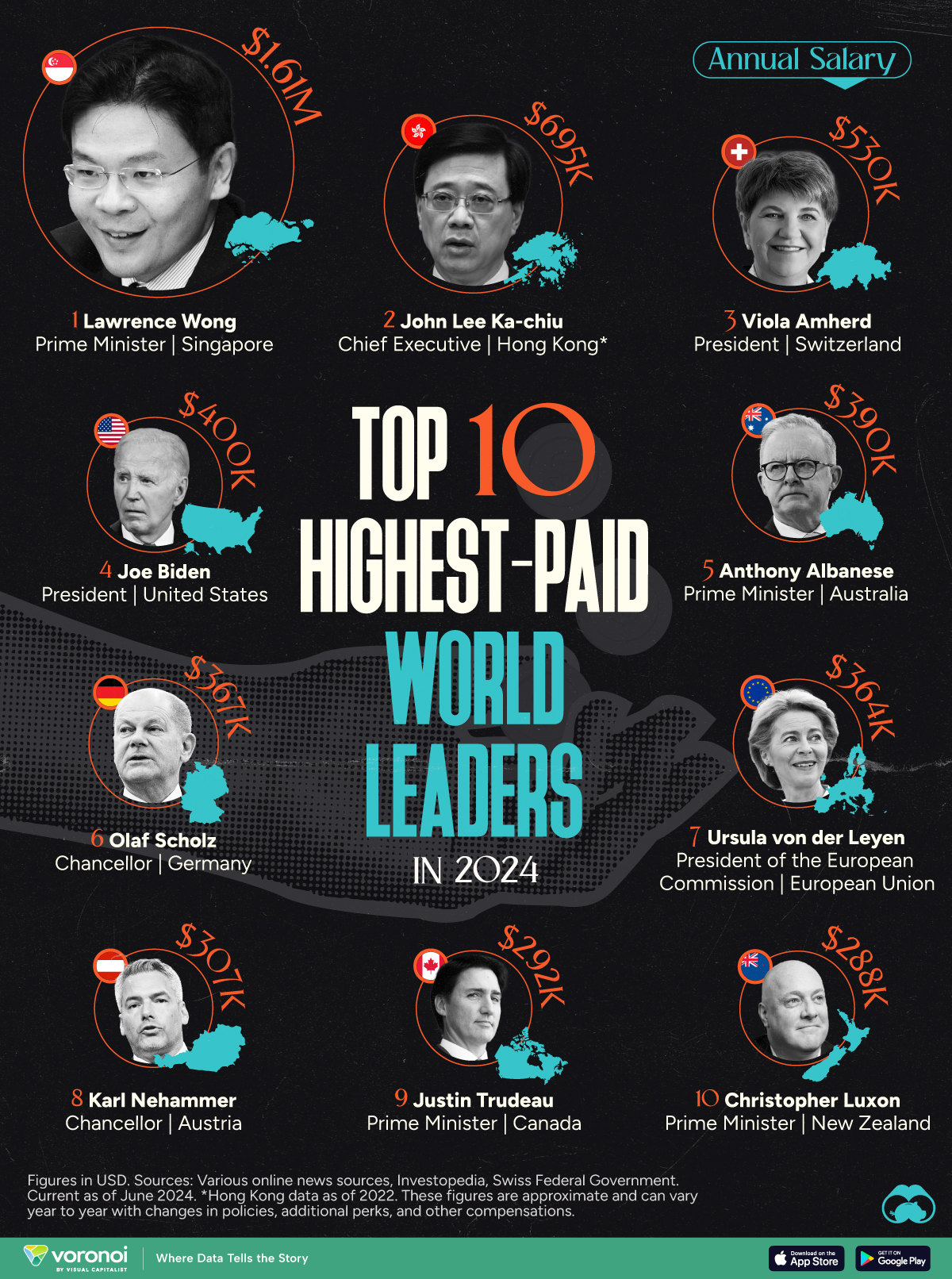 This graphic ranks the top 10 highest-paid world leaders in 2024, according to various sources. Hong Kong data is as of 2022. All figures are in USD and are approximate. They can vary year to year with changes in policies, additional perks, and other compensations.