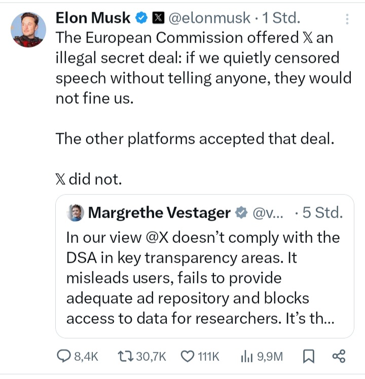 JUST IN: Elon Musk says "the European Commission offered X an illegal secret deal: if we quietly censored speech without telling anyone, they would not fine us.