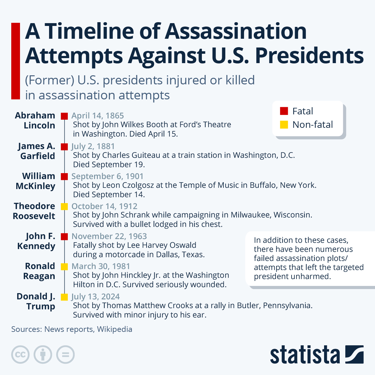 History is full of examples of violence against elected leaders and the United States is no exception. As our chart shows, four U.S. presidents have been assassinated while in office, with Ronald Reagan the only sitting president to survive an assassination attempt severely injured. Like Trump, former president Theodore Roosevelt was campaigning for a return to the White House, when he was shot and injured in an attack in 1912. Roosevelt survived with a bullet lodged in his chest muscle, after the bullet’s impact had been softened by folded paper and a glasses case in his pocket.