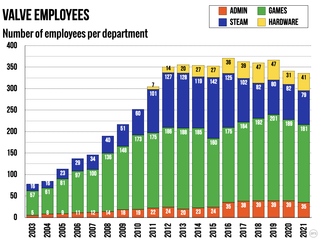 The recent data comes from a poorly redacted document in Wolfire's antitrust lawsuit against Steam, as first noticed over the weekend by SteamDB's Pavel Djundik. While the key data in the document has now been properly hidden in the court docket, The Verge captured the raw numbers from a table labeled "Employee Headcount and Gross Pay Data, 2003-2021."