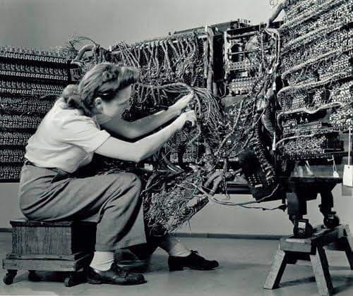 A photo by Berenice Abbot of a woman wiring an IBM computer, 1948.