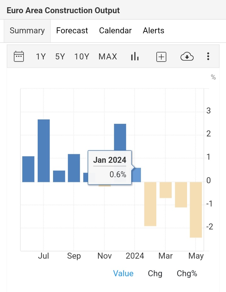 Construction output in the Euro Area fell by 2.40% in May 2024 compared to the same month the previous year.