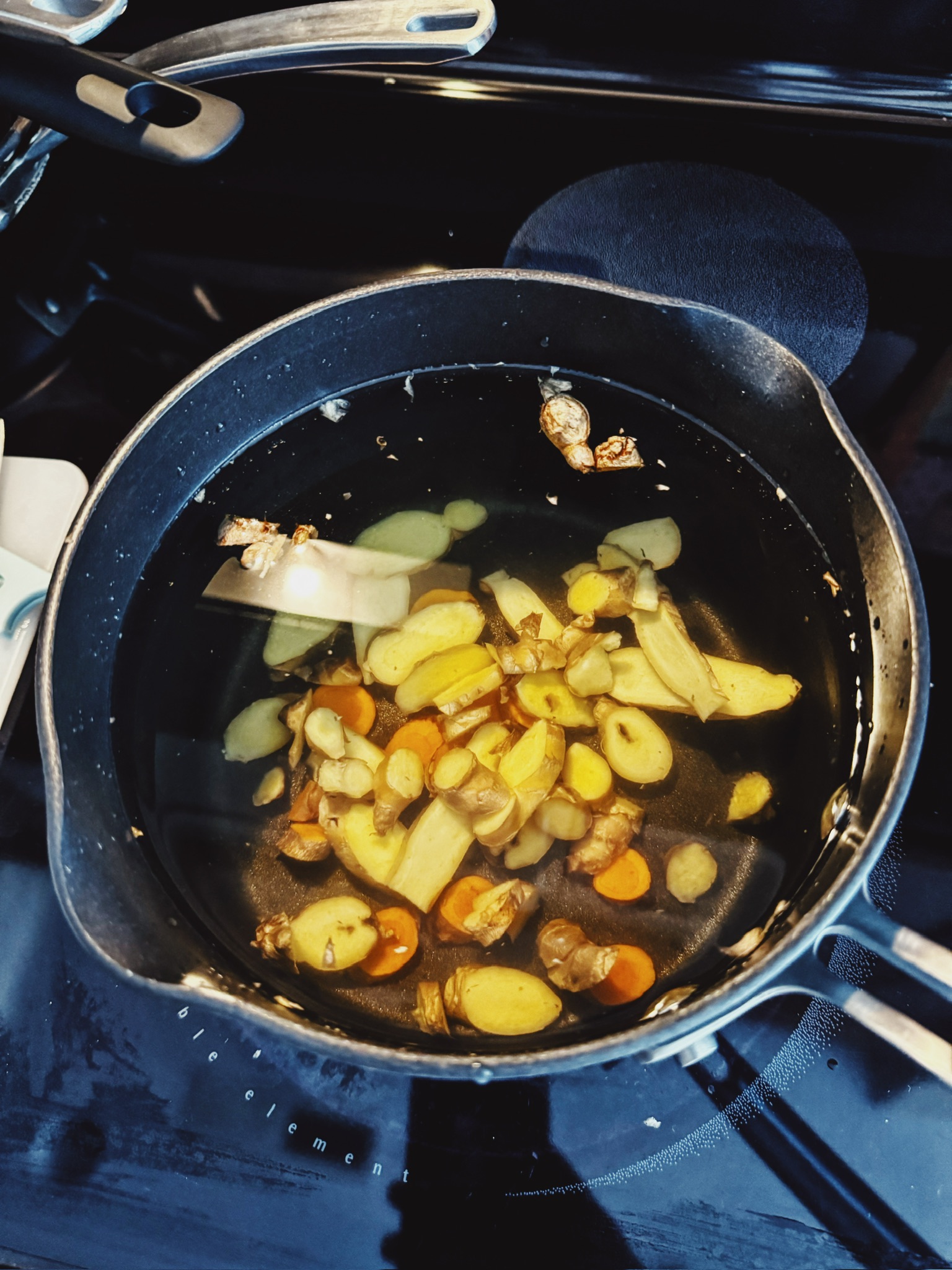 Places sliced ginger and turmeric in 8-10 cups of water and bring to boil (putting the roots in before the water boils allows them more soaking / infusion time as the water heats).