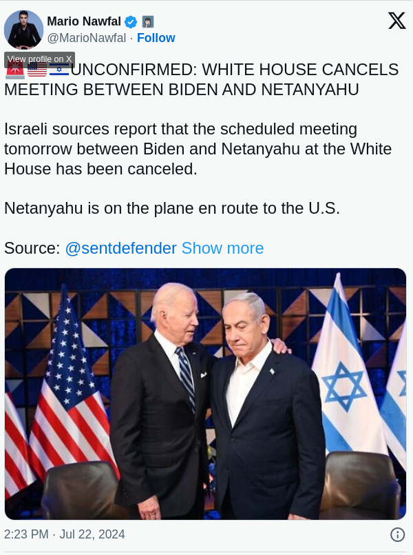 Rumor mill is saying that the scheduled meeting with Netanyahu - Biden this week has been canceled. But Ben has decided to meet with Trump instead.....