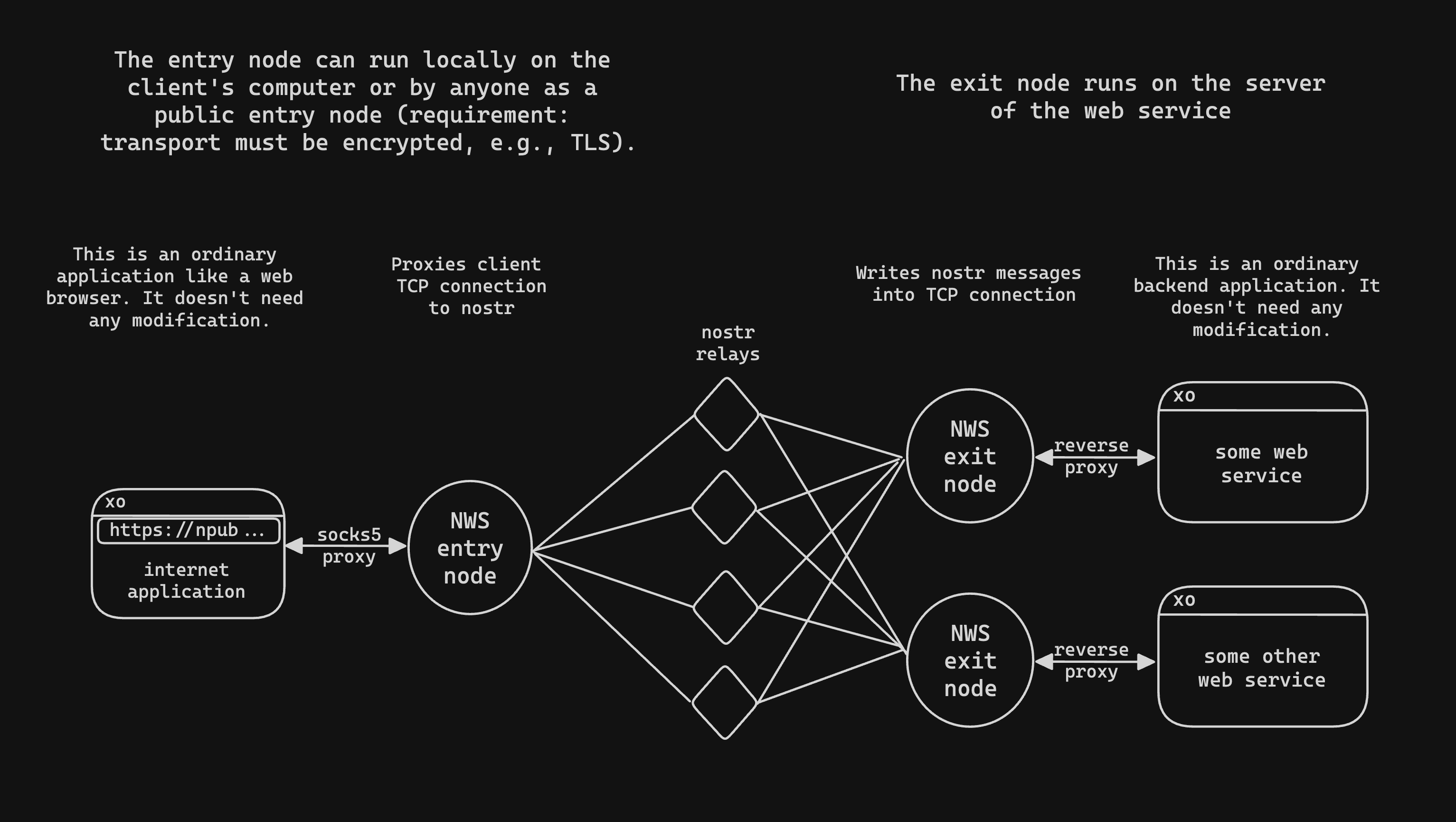 Nostr Web Services (NWS) replaces the IP layer in TCP transport using Nostr, enabling a secure connection between clients and backend services. Exit nodes are reachable through their nprofiles, which are combinations of a Nostr public key and multiple relays.