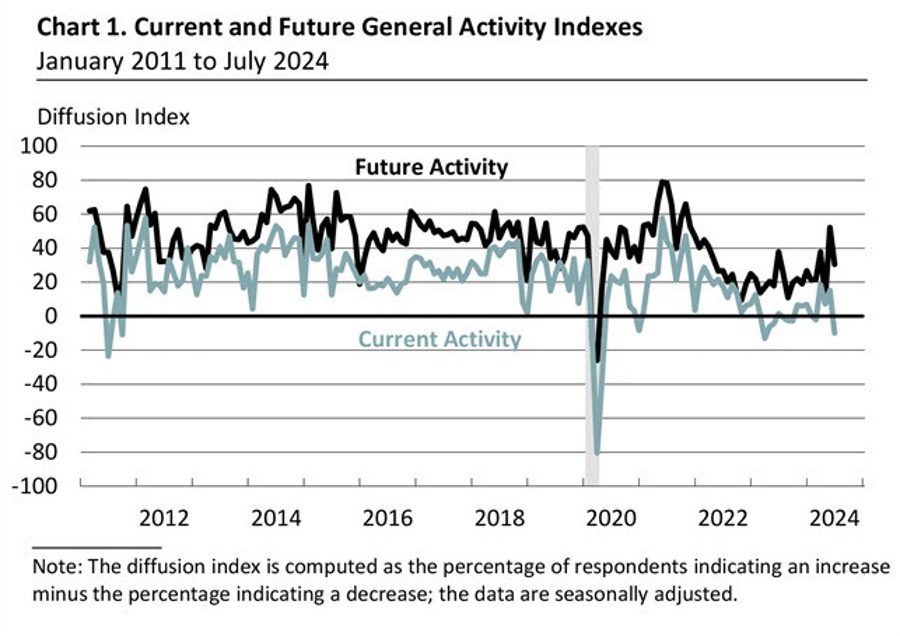 The latest Nonmanufacturing Business Outlook Survey from the Philadelphia Fed shows a downturn in nonmanufacturing activity in July. Key metrics, including general firm activity, new orders, and sales/revenues, have all turned negative. The employment index for full-time workers also indicates a decline. Despite ongoing price increases, firms maintain cautious optimism for growth in the coming six months, though confidence is waning.