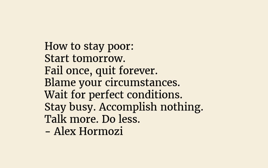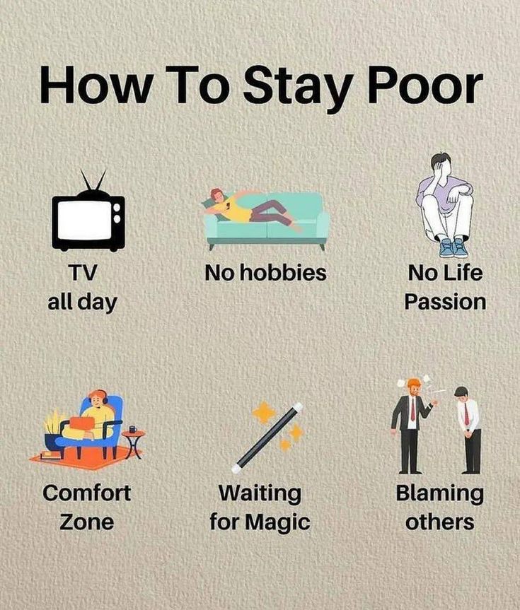 Complain about everything except your own attitude and mindset. Blame your poverty on your parents, the system, the government, and the banks that refused to lend you money. They are all bad and do not want you to get rich.
