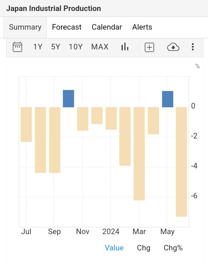 Japan's industrial production has sharply declined, plummeting 7.3% in June 2024 compared to the previous year. This marks the fifth consecutive drop this year and the steepest decline since September 2020. As the country grapples with this downturn, monetary policy is under pressure to gradually raise interest rates to combat inflation and escape the low-interest trap. How will Japan navigate this economic turbulence?
