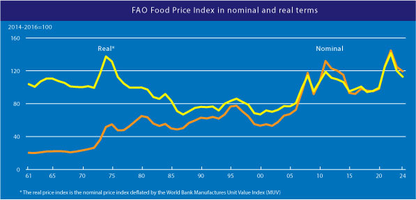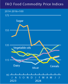 The FAO Food Price Index recorded a slight dip to 120.8 in July 2024, down from 121 in June. Lower cereal prices balanced out higher costs for vegetable oil, meat, and sugar, with dairy prices remaining steady.