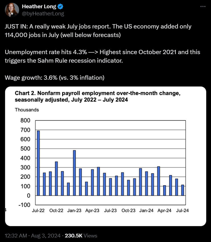 The U.S. job market is showing clear signs of weakening, signaling a potential recession on the horizon. Nonfarm payrolls in July reported a significant drop to 114,000 from the previous 206,000, falling short of the estimated 176,000. Additionally, the unemployment rate edged up to 4.3% from 4.1%, missing expectations. Stay prepared for the economic downturn.