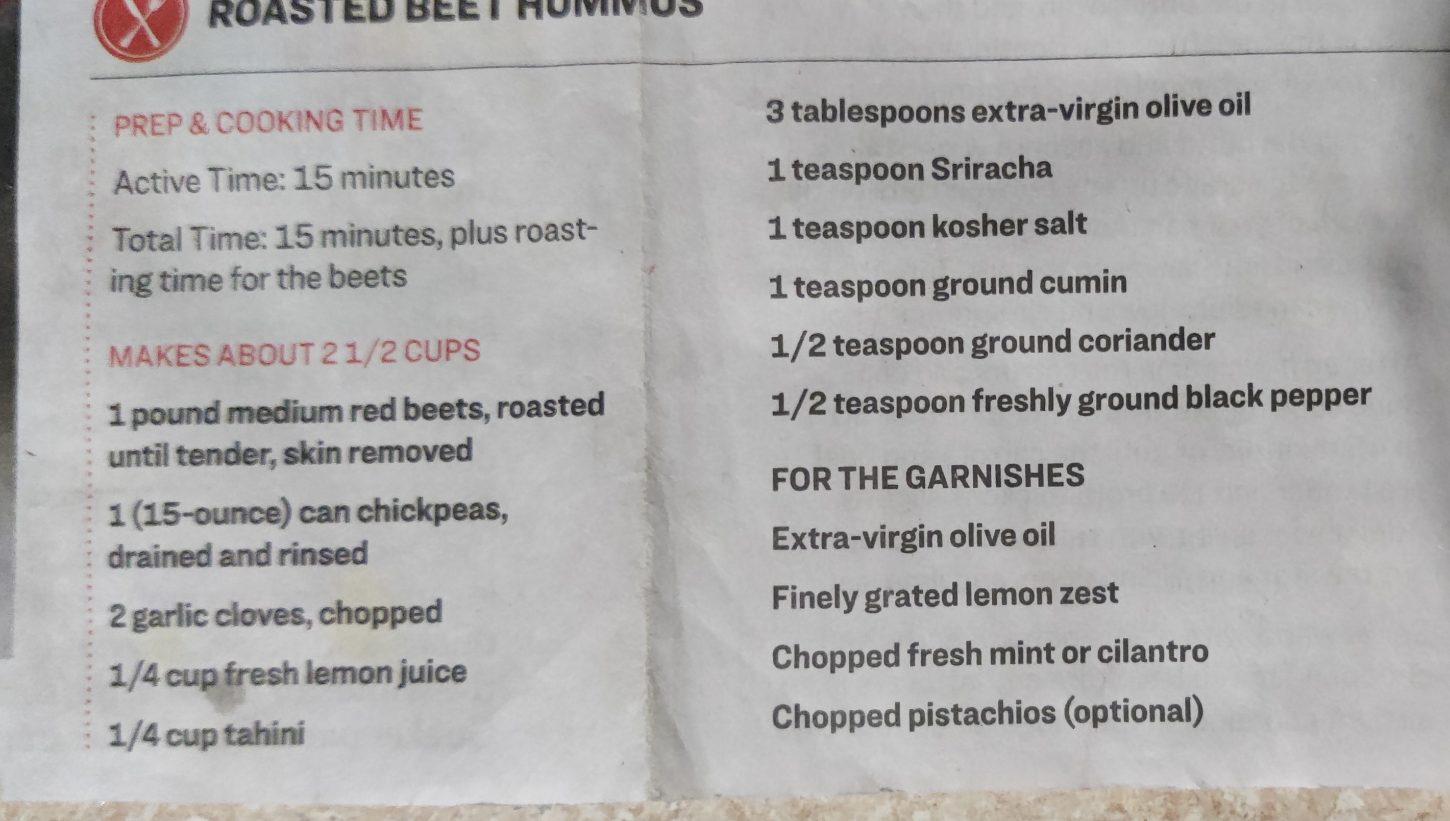 My wife tossed a bunch of ingredients into the food processor (no recipe, no measuring) and out came amazing hummus.