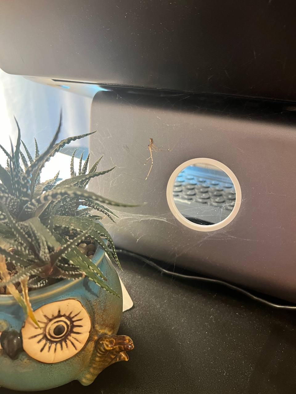 this spider has spun up a web overnight between a laptop and a succulent. i had to gently relocate the spider.