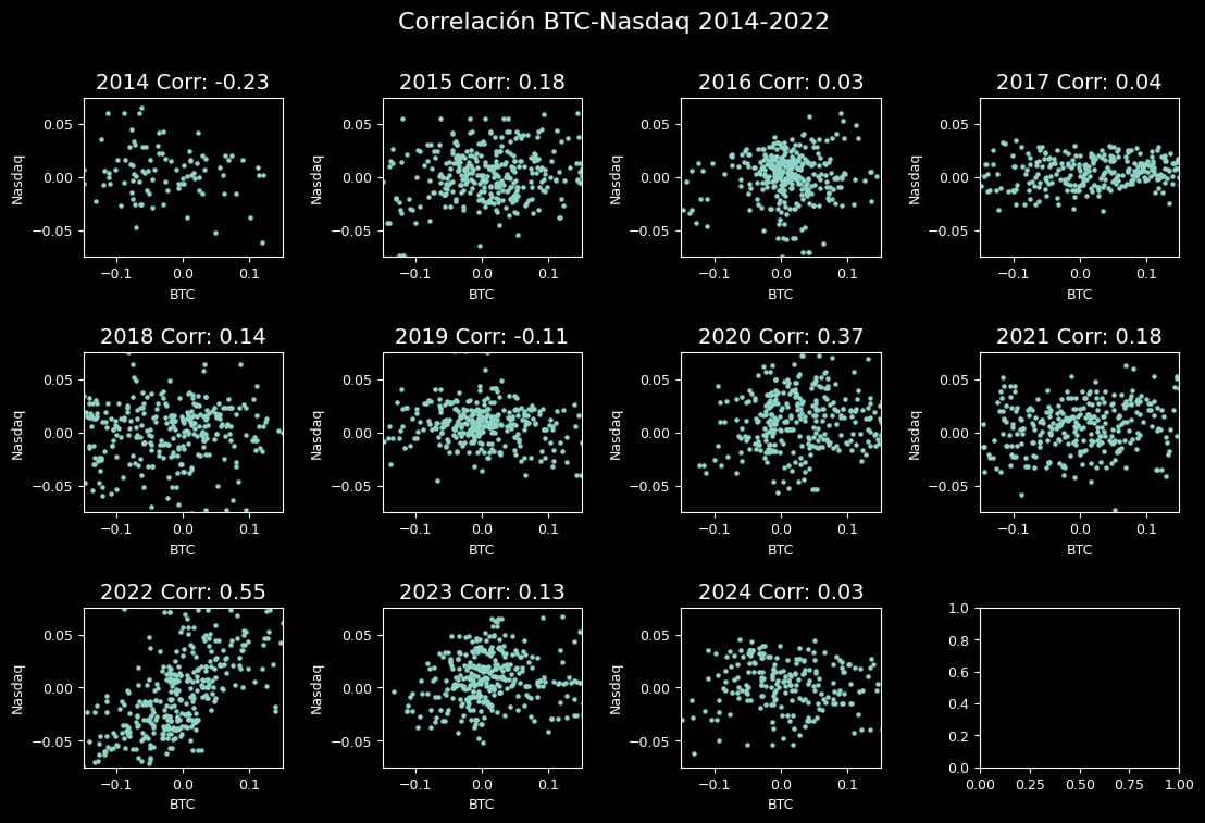 In 2022 eneded with a correlation of 0.55 (median) vs Nasdaq. In 2023 and 2023, this was very low, so w can say that there aren't correlations between Nasdaq movement and bitcoin.