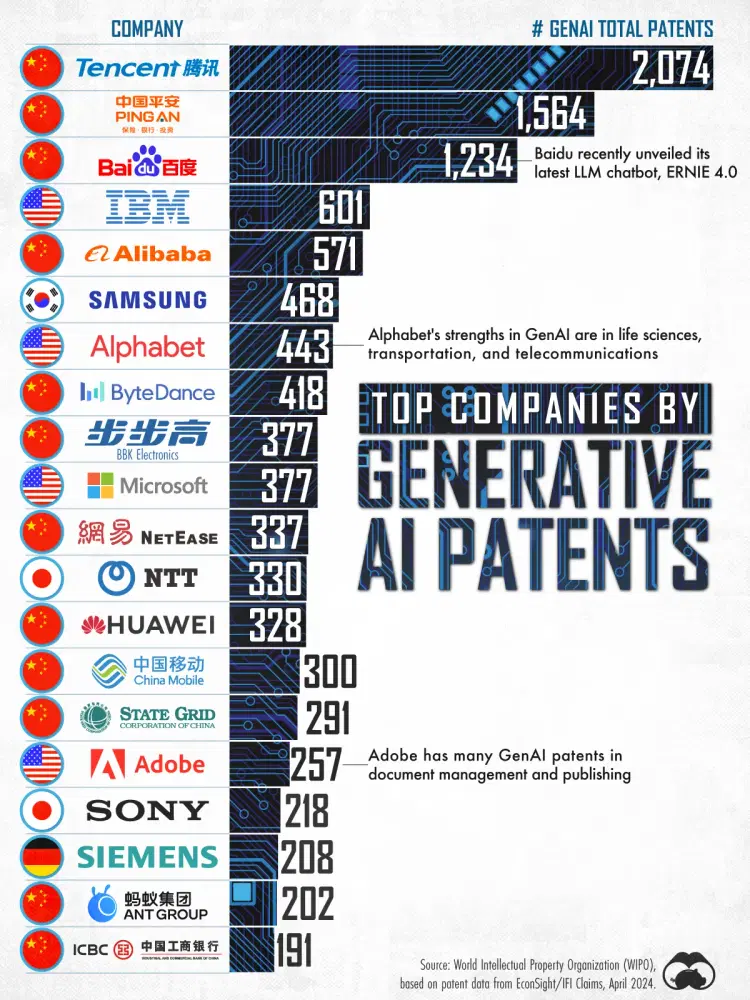 https://m.stacker.news/44113Detail :https://www.visualcapitalist.com/ranked-top-companies-by-generative-ai-patents/