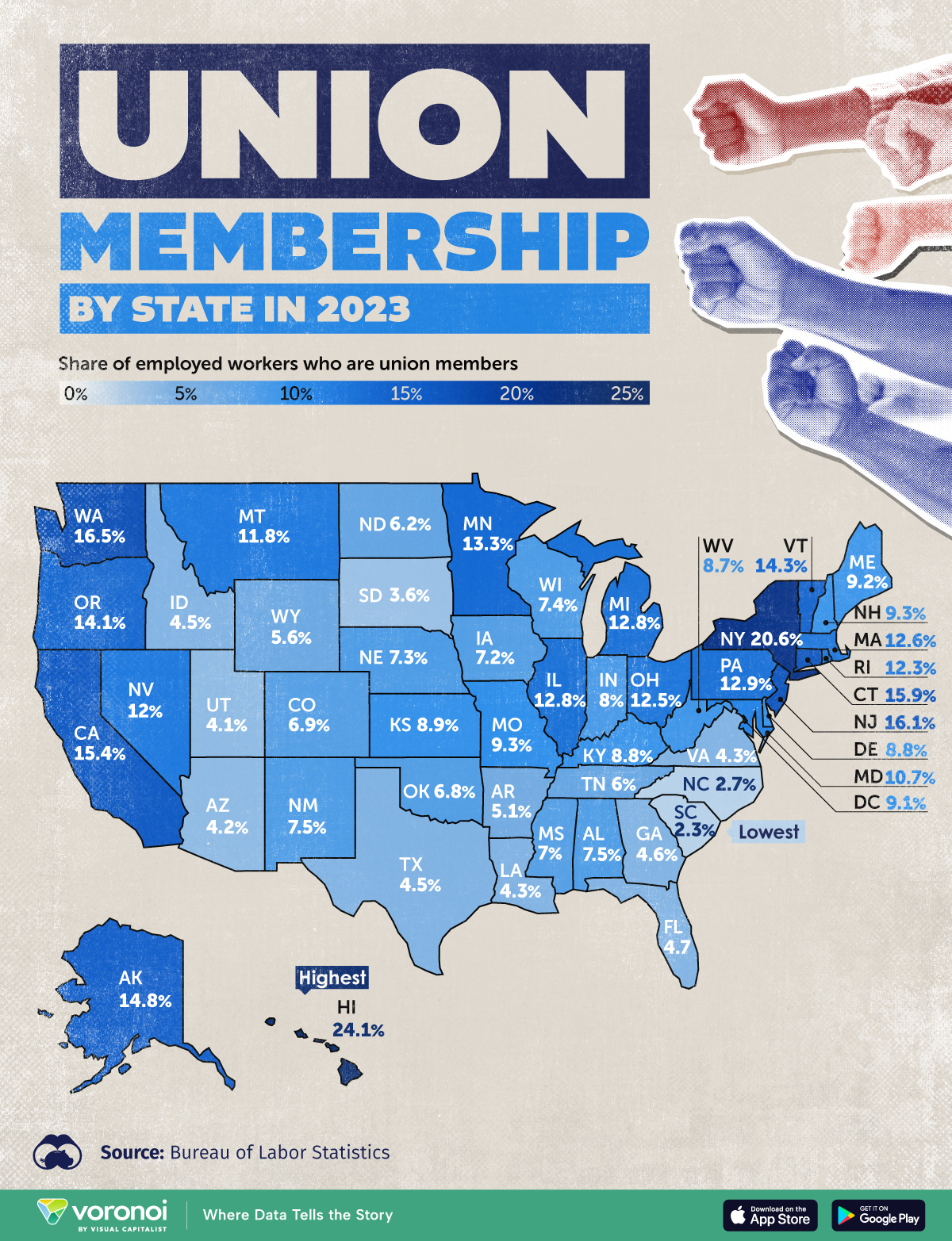 Union membership varies significantly by geographic area as well, with this map showing the rates of union membership by U.S. state in 2023.