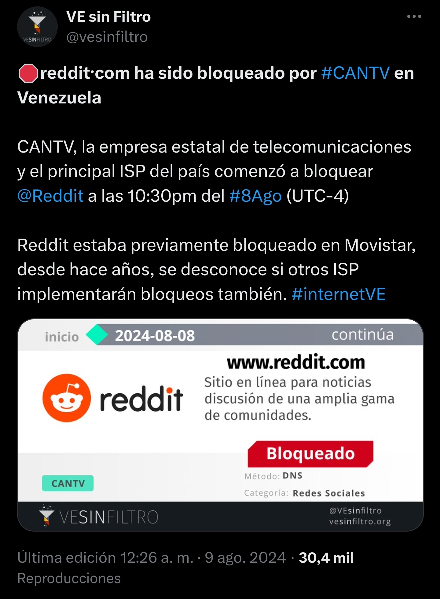 CANTV, the state telecommunications company and the country's main ISP, began blocking @Reddit at 10:30pm on #8Aug (UTC-4)