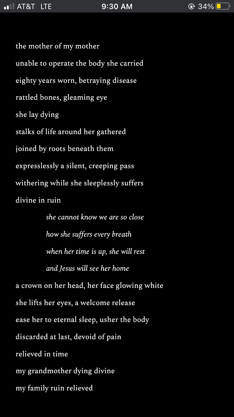 I also wrote something down that night. I think of it as a poem in and of itself so I guess the "poetic" aspect of the moment should be double or triple checked: