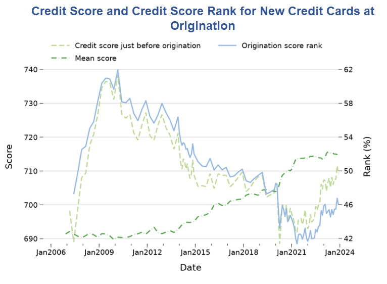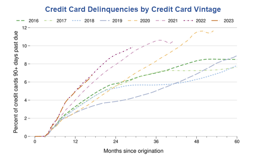 Delinquencies have been concentrated among credit cards originated in the last few years and we show these credits cards were much riskier than in previous years. Two factors explain this extra risk: First, lending standards loosened a bit in 2021 and 2022 judging by a decline in credit scores at origination. At the same time, pandemic aid and forced savings pushed average credit scores up sharply. Effectively, by not tightening significantly, lenders were originating cards much further down the risk spectrum. We show this shifting risk composition explains why delinquencies are higher than in 2019.
