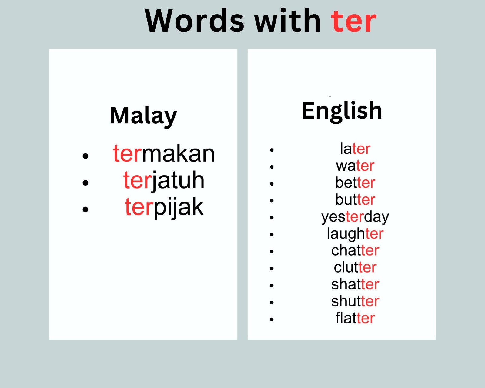 Some students do not know how to read ‘ter’. However, ‘ter’ is found in many English words. Additionally, it is a prefix in Malay.