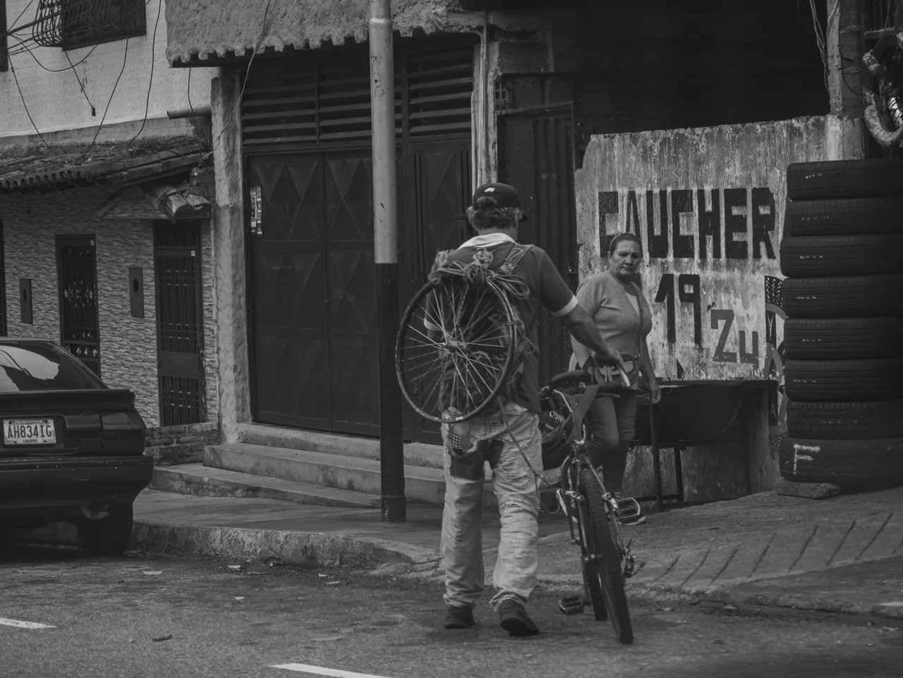 What caught my attention in this photo was the way the man was carrying a bicycle wheel on his back and was heading straight to a tire shop.